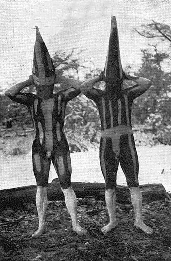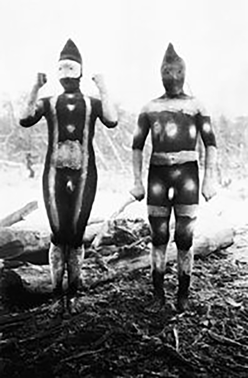 Halaháches es “sumamente grotesco y aterrador; pero cuando está de humor, es cómico”. Su cuerpo es blanco con anchas bandas horizontales de color rojo. La “cerrada máscara blanca que se ajusta a su cabeza ostenta largos cuernos hechos con un arco, forrados y pintados, que miden alrededor de un metro”. Se mueve rápidamente de lado a lado y constantemente “agarra su mentón con la mano izquierda, levantando el codo, mientras que con un largo y puntiagudo palo que sostiene con la mano derecha, hace amplios movimientos semicirculares”.61 Su llegada es anunciada por los hombres cantando ua repetidamente. Las mujeres, al oírlo, entonan Halaháches62 para dar la bienvenida al numen que va a abolir temporalmente el reinado de Xalpen, un hecho que es subrayado con la aparición de los klóketen libres y sin máscara sobre el escenario. Pese al carácter liberador de Halaháches, “es para él un placer ser cruel con [los hombres], atormentarlos arbitrariamente e incluso matarlos.63 Por eso las mujeres arrojan pequeñas bolas de arcilla contra él, para que abandone su costumbre de maltratar a los hombres”; proyectiles que el daimon siempre esquiva ágilmente sobre el escenario.64 Hayílan Los Hayílan son sirvientes o “peones” de Shoort. Van encapuchados como éste, aunque son contrahechos y de andar torpe. Insolentes a la vez que cómicos, suelen aparecer en parejas, uno viejo y el otro más joven, como si hubiesen llegado desde el bosque. Los klóketen han de trabajar para los Hayílan y éstos deben vigilarlos cuando los novicios salen a cazar, aunque con frecuencia extravían a sus pupilos y caminan de regreso al campamento llenos de enojo. Entonces, de improviso, las mujeres ven a un par de Hayílan cubiertos de lodo, uno cargando al otro sobre las espaldas. El de abajo tropieza, resbala y a poco ambos caen al suelo, rodando uno sobre otro como si estuvieran exhaustos. Luego, apoyándose pesadamente en sus bastones retorcidos, muestran gran irritación porque sus klóketen se les han escapado. Las madres se juntan en el lindero del bosque y les cantan ho kreek.65 Como esta palabra es un nombre para Shoort, implica una comparación burlona y esto lo captan los Hayílan y se enojan aún más. (...) Sólo falta eso para que los Hayílan se exasperen del todo. Amenazan a las mujeres con los puños y hacen pantomimas que dan a entender que azotarán a los klóketen cuando los agarren.66 |