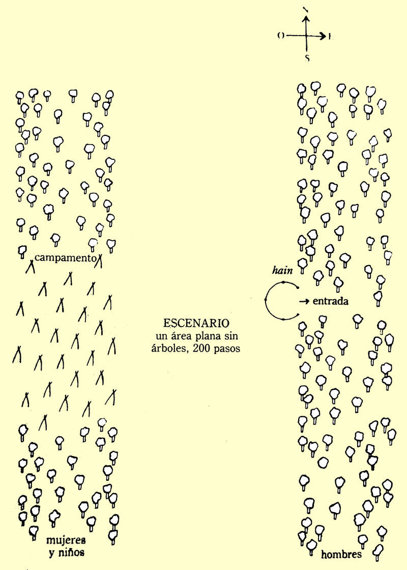 ![]() Croquis del escenario, el campamento y la choza ceremonial del hain. Anne Chapman, op. cit. |