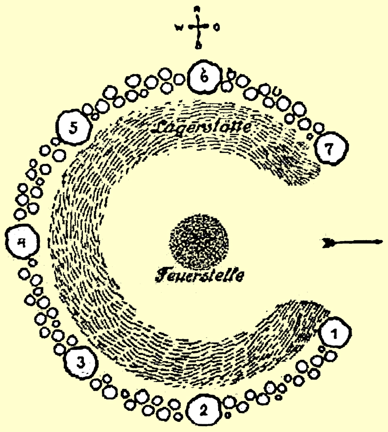 ![]() Croquis de la choza ritual del hain. Martín Gusinde, ibid. (No está dibujada la línea en dirección este-oeste que divide la choza en dos hemisferios). |