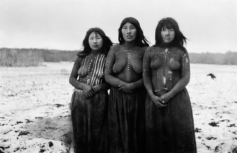 ![]() Tres jóvenes mujeres selk’nam preparadas para una danza en el hain de 1923. La del centro es Ángela Loij, informante de Anne Chapman décadas más tarde. Fotografía de Martín Gusinde. |