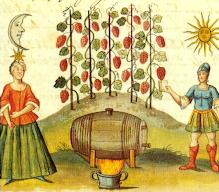 Vasijas necesarias: conseguid tres o cuatro alambiques de cristal de un galón o dos de capacidad cada uno, y un Balneum cuadrado de dos pies y medio para que pueda contener varios recipientes al Baño María. Conseguid aproximadamente unos seis galones del más fuerte vinagre de vino tinto (el vinagre de clarete o de vino blanco es demasiado flojo), hecho de tinto, jerez o moscatel, y poned en marcha al mismo tiempo tantos alambiques como vuestro Balneum pueda contener. Poned aparte una pinta de lo que fluya en primer lugar, ya que es flojo y no apto para este uso. Destilad todo el resto hasta que el alambique quede seco. Lavad el alambique con un poco del primer fluido (la flema), limpiadlo con un trapo y secadlo. Luego echad en el alambique lo que destilásteis y proceded como antes, separando la primera pinta y repitiendo la operación cinco veces. Así pues, de un galón debéis obtener tres pintas del espíritu de vinagre, y de vuestros seis galones solamente dos galones y dos pintas. Y si vuestro espíritu es aún demasiado flojo, destiladlo todavía más. Guardadlo en un recipiente de cristal tapado para elaborar con él vuestro menstruum. Debéis taparlo con un corcho y cubrirlo después con una piel. Debéis proveeros de tres fuertes vasijas verdes para elaborar menstruum, de cuatro pintas de capacidad cada una, con esterillas alrededor de sus bases. Para enlodarlas, ajustad a su boca un tapón de madera seca, previamente hervido y secado en el horno; fundid cera gruesa para tapar sus poros, y pegad bien un papel marrón encima de ello. Luego preparad lodo de arcilla, estiércol de caballo, y cenizas, y enlodadlo todo completamente. Alambiques de cristal: Dos o tres para destilar las primeras infusiones en la tierra. Se necesitan tres o cuatro envases de vidrio verde, de tres o cuatro pintas de cada uno. La norma de todas las destilaciones: Debéis pegar papel marrón en el cierre superior del alambique, y también debéis pegar el tubo receptor y el pico del alambique para que así no se escape ninguna fuerza. Potes de calcinación: Debéis proveeros de una docena aproximadamente, puesto que muchos de ellos se romperán cuando sean sometidos a un fuego fuerte; así pues debéis mantener vuestro fuego suave. |