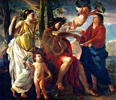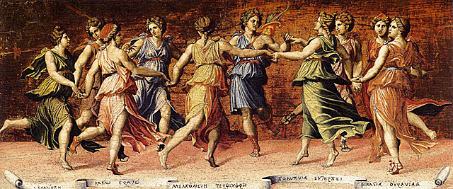 Por esto es que los poetas y sabios, cantores y bardos siempre invocan al principio y al final a las Musas, para que sean ellas quienes, a su través, les revelen lo verdadero y eterno, aunque las diosas también “saben decir muchas mentiras con apariencia de verdades; y sabemos cuando queremos, proclamar la verdad”15. Además, dice Platón que los verdaderos poetas son arrebatados por una inspiración y fuerza celestial que ellas les infunden a través de la palabra que brota cual dulce néctar de su boca; inspiración que se manifiesta por una “locura”, el “delirio” o manía. Luego, cuando el poeta retorna a su sano juicio, no sabe ni comprende cómo han salido esas palabras ritmadas de su boca, ni cómo ha sido capaz de ejecutar “como los dioses”. El tercer grado de locura y de posesión viene de las Musas, cuando se hacen de un alma tierna e impecable, despertándola y alentándola hacia cantos y toda clase de poesía, que al ensalzar mil hechos de los antiguos, educa a los que han de venir. Aquél, pues, que sin la locura de las Musas acude a las puertas de la poesía, persuadido de que, como por arte, va a hacerse un verdadero poeta, lo será imperfecto, y la obra que sea capaz de crear, estando en su sano juicio, quedará eclipsada por la de los inspirados y posesos. Todas estas cosas y muchas más te puedo contar sobre las bellas obras de los que se han hecho “maniáticos” en manos de los dioses16. Nicolás Poussin, La inspiración del poeta, Museo del Louvre, París. El cantor, flechado por Amor, tiene un solo deseo direccionado: ir en pos del conocimiento del Sí mismo, y dejarse raptar por la música celeste, por su Misterio, encarnando el Ser, como la más bella sinfonía, la “música” emitida del Silencio absoluto por una Voz que se hace Inteligencia viva; es decir, se entrega, afinando el oído interior, escuchando y penetrando en lo que le dice el lenguaje misterioso de la Deidad que se expresa a través del símbolo y el mito, vivificado por el rito de la memoria y el recuerdo de Sí hacia la plena identificación con el Ser. Y oyendo las melodías ritmadas en su alma, se pone él mismo a ritmo con todo lo que es, en concordancia y armonía con las esferas y los númenes que las rigen. Es el canto de las Musas lo que el poeta percibe cuando ellas danzan en torno al luminoso Apolo, “el que lleva la cítara y el corvado arco que hiere desde lejos, revelador de la infatigable determinación de Zeus”17; tocado por su gracia, se deja encantar bailando y cantando también él al son del ie, invocación, que puede considerarse análoga a los cantos y gritos de las Ménades y Ninfas del cortejo de Dioniso-Baco por la simbólica que vincula este dios con Apolo.