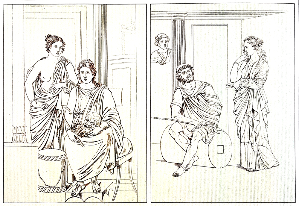 Izquierda: macellum y personificación de la comedia. Derecha: Ulises y Penélope.