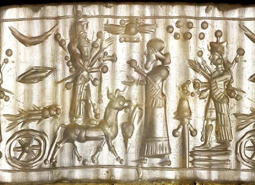 Sacerdote junto con Marduk e Ishtar, sello asirio hallado en Samos (Grecia).