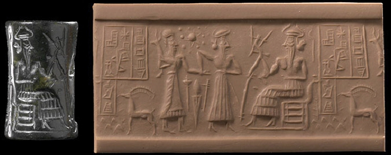 Escena sacrificial frente al dios entronizado, sello acadio 2000 a. C.