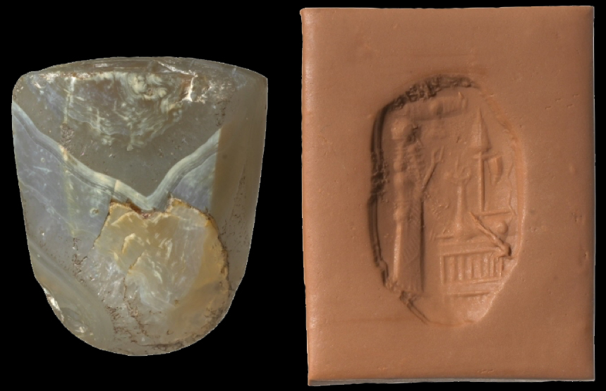 Sello babilónico de un orante frente a los atributos de Marduk y Nuba.