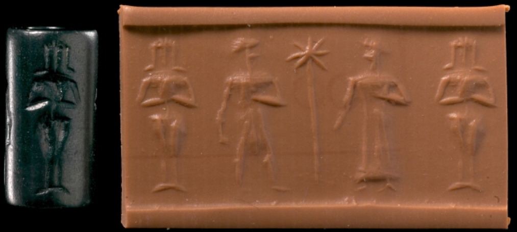 El Rey-Dios en posición orante frente a la figura de Ishtar, sello babilónico 1800 - 1700 a. C.