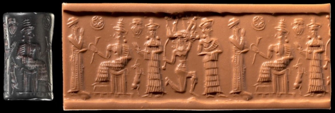 Ritual de sacrificio frente a un dios entronizado, sello babilónico, 1850 - 1595 a. C.