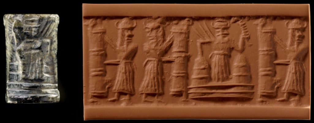 | Shamash, dios solar, resplandece y se eleva entre dos picos de montaña al mismo tiempo que dos dioses abren el paso de la puerta celestial, sello acadio, 2350 - 2150 a. C. |