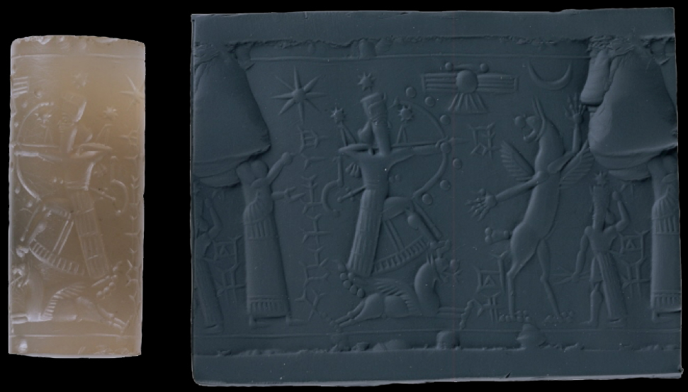 Escena mitológica asiria sobre el mito de Anzu. En escena Anzu, Ninurta y Hadad, siglo IX a. C.