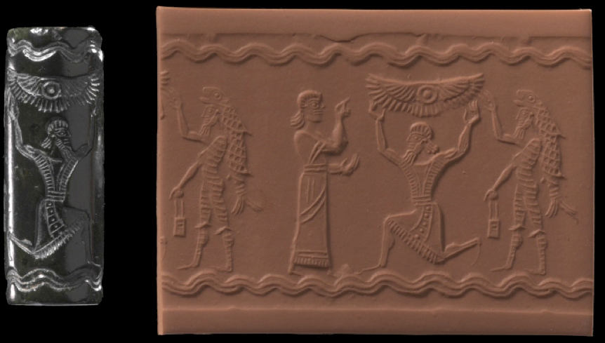 Un sacerdorte y un hombre-pez enmarcan a un tercero que sostiene de rodillas el disco solar alado, sello asirio, 1000 - 625 a. C.