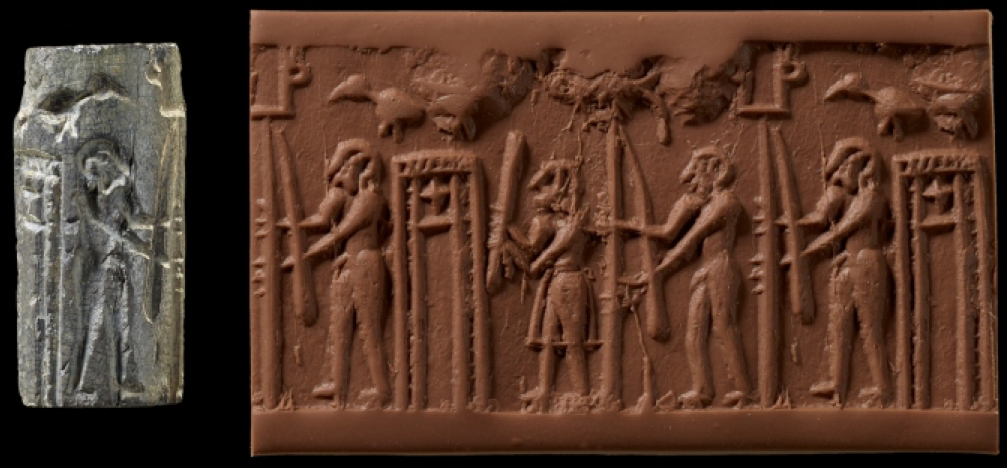 Procesión frente a la entrada del templo, sello del periodo de Uruk, 3300 - 3000 a. C.