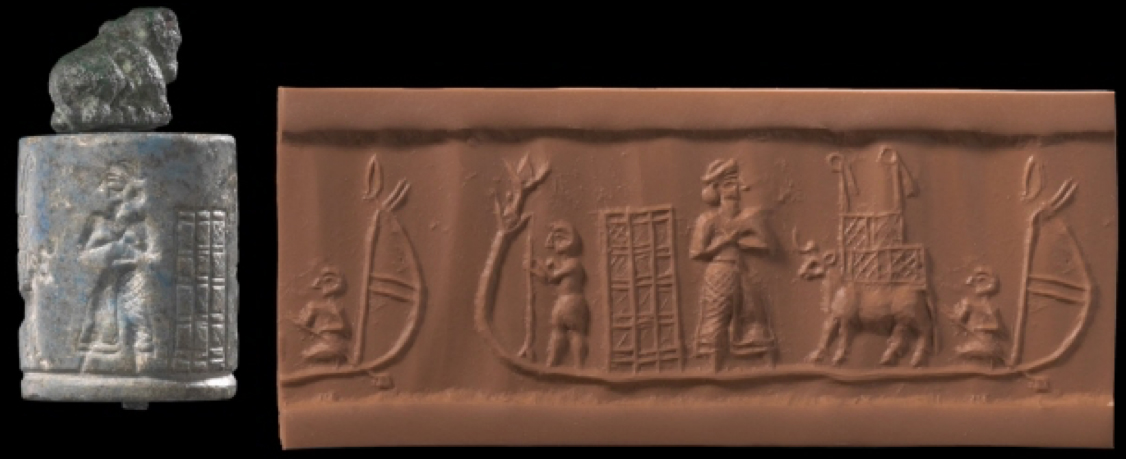 Escena cultual en barca, sello del periodo de Uruk, 3300 - 2900 a. C.
