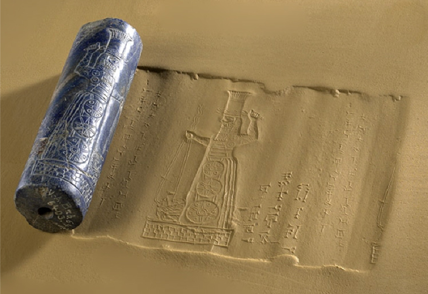 | Adad, dios de la tormenta, sobre su pedestal, sello babilónico. “Al dios Marduk, gran señor, su señor, Esarhaddon, rey del universo, rey de Asiria, ha dado [el sello] por su vida". |