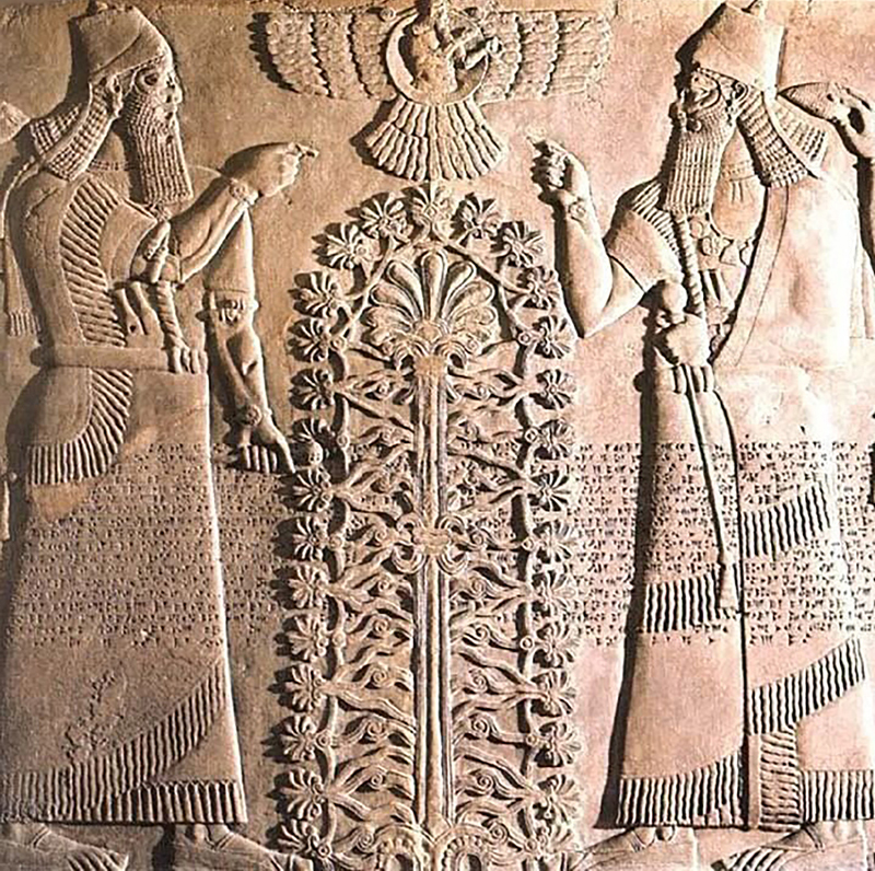 ![]() Relieve en piedra del Árbol Sagrado, prototipo del Árbol de la Vida proveniente del trono del palacio de Ashurnasirpal II en Nimrud 870-860 a. C., Museo Británico. Londres |